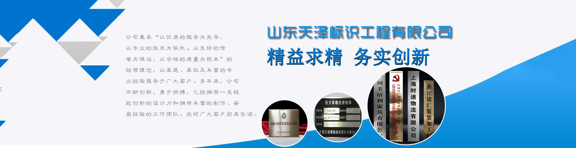 山東天澤標識工程有限公司是一家集創(chuàng)意設(shè)計,生產(chǎn)制造,安裝服務(wù),售后保障為一體的多元化公司。我們擁有先進的設(shè)備,專業(yè)的人才,專業(yè)從事蝕刻,仿古,做舊,絲印,烤漆等工藝加工。主要生產(chǎn)機器銘牌、科室牌、樓棟牌、門牌、不銹鋼牌、銅牌、鋁牌、鈦金牌、砂金牌、授權(quán)牌、道路標識牌及各類金屬板材的裝飾花紋,同行可代工。 我們一直秉承“以質(zhì)量、效率、服務(wù)博得客戶的滿意,以誠信、合作雙贏求得發(fā)展”作為核心價值,立足創(chuàng)新產(chǎn)品質(zhì)量,誠信服務(wù),真誠合作,共同發(fā)展,是我們始終如一的追求。為客戶提供優(yōu)質(zhì)的產(chǎn)品是我們永恒的方針。我們將不斷超越自我,一如既往地為客戶創(chuàng)造價值,提供更優(yōu)質(zhì)的產(chǎn)品和服務(wù)!